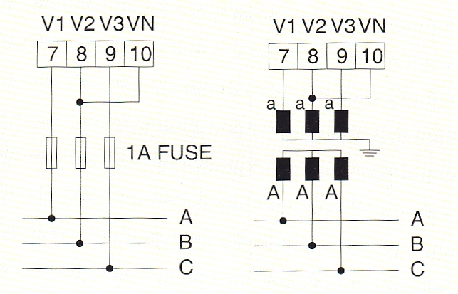 2、標(biāo)準(zhǔn)額定輸入電流為5A, 大于5A的情況應(yīng)使用外部CT。如果使用的CT上連有其它儀表, 接線應(yīng)采用串接方式。接線方式