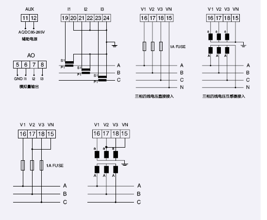 輸入標(biāo)稱值電壓:100V、220V、380V、450V、電流:1A、5A或由客戶指定